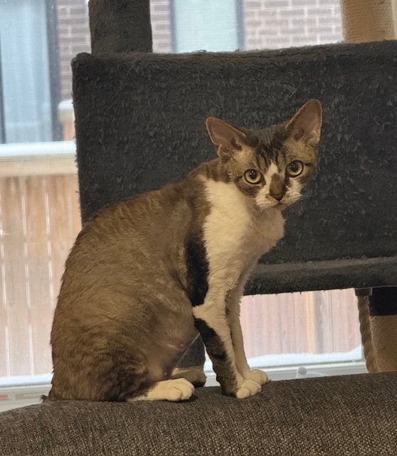 Alice beats to her own drum. She is a stunning example of the Devon Rex breed, and she knows it. She is affectionate on her own terms, looking for the love when it suits her.